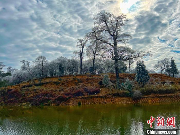 Photo taken on January 11, 2022 shows that rime appears on the upper part of a mountain in Guangxi Zhuang Autonomous Region, while the lower part remains emerald. (Photo: China News Service/Liang Qiang)