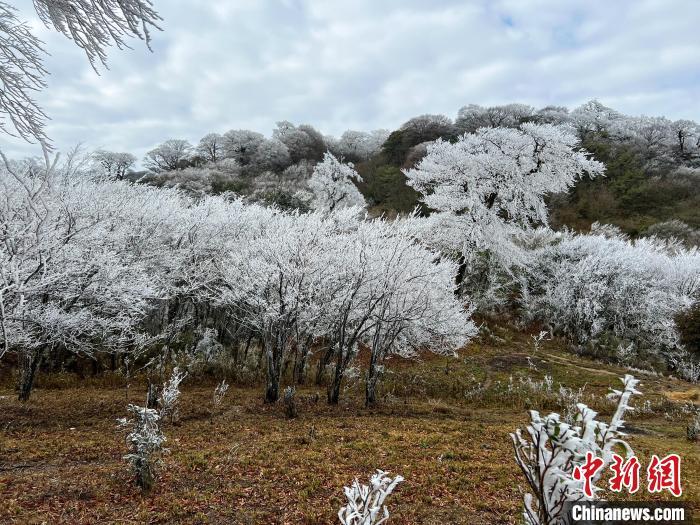 Photo taken on January 11, 2022 shows that rime appears on the upper part of a mountain in Guangxi Zhuang Autonomous Region, while the lower part remains emerald. (Photo: China News Service/Liang Qiang)