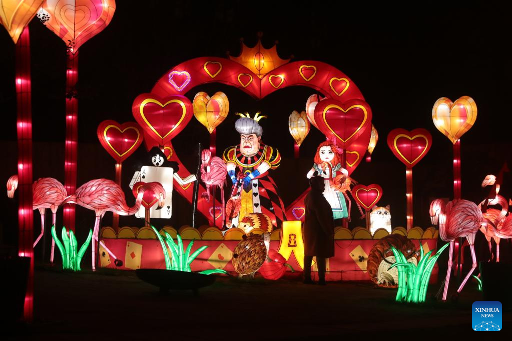 Light installations are pictured during the sixth edition of China light festival themed "Alice in Wonderland" at the Antwerp Zoo in Antwerp, Belgium, Jan. 12, 2022. (Xinhua/Zheng Huansong)