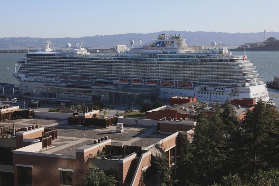 Cruise ship Majestic Princess is seen at a pier in San Francisco, the United States, on Oct. 11, 2021. Majestic Princess became the first cruise to call on the Port of San Francisco on Monday since the port ceased operation of cruises due to the COVID-19 pandemic last year. (Photo by Liu Yilin/Xinhua)