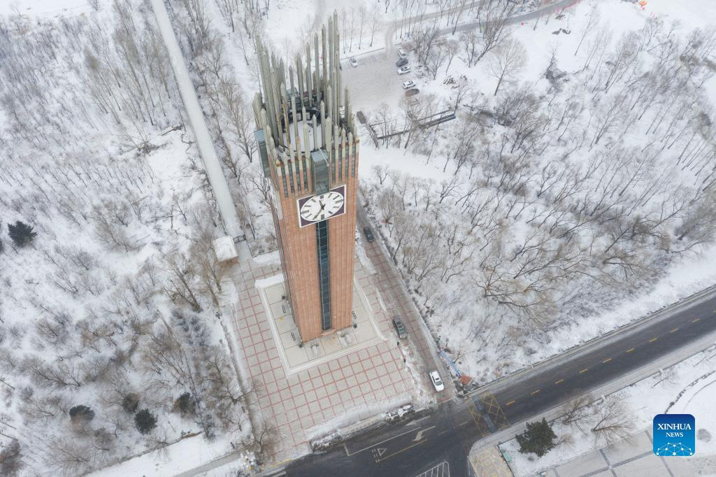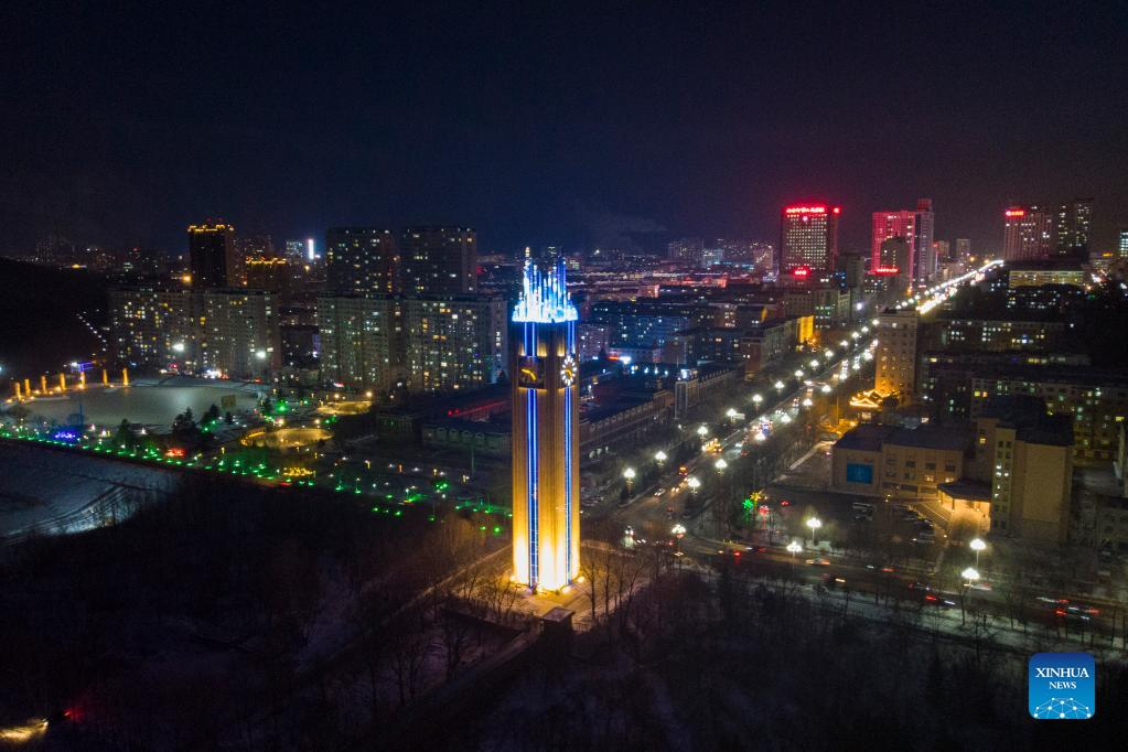 Aerial photo taken on Jan. 12, 2022 shows a street named after China's first Winter Olympic champion Yang Yang in Qitaihe City, northeast China's Heilongjiang Province. To date, six of China's 13 Winter Olympic gold medals have been claimed by athletes trained in Qitaihe City. The city has been stepping up efforts to train winter sports talents in recent years by building schools that teach short track speed skating, setting up training base for provincial sports team, as well as holding ice and snow sports events. (Xinhua/Xie Jianfei)