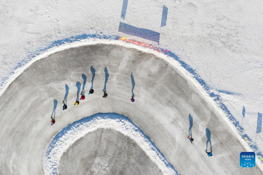 Aerial photo taken on Jan. 12, 2022 shows enthusiasts skating on an ice rink in Qitaihe City, northeast China's Heilongjiang Province. To date, six of China's 13 Winter Olympic gold medals have been claimed by athletes trained in Qitaihe City. The city has been stepping up efforts to train winter sports talents in recent years by building schools that teach short track speed skating, setting up training base for provincial sports team, as well as holding ice and snow sports events. (Xinhua/Xie Jianfei)