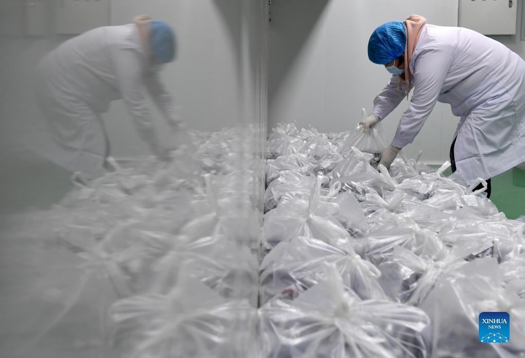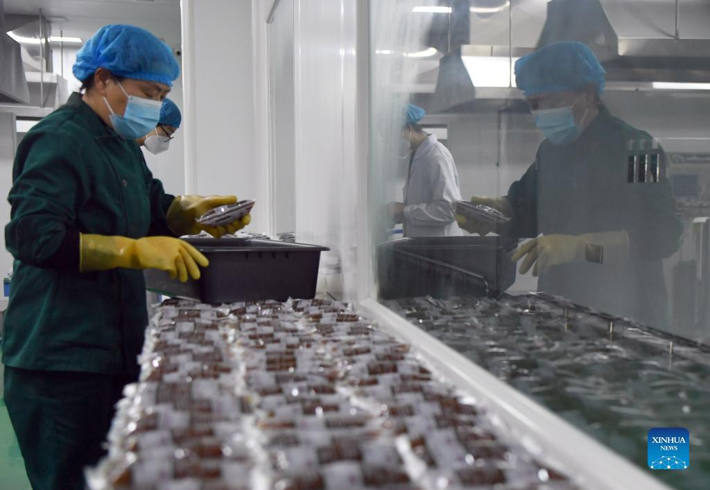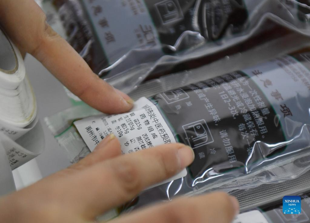 A staff member packs traditional Chinese medicine (TCM) decoctions at Yuzhou TCM hospital in Yuzhou City, central China's Henan Province, Jan. 13, 2022. Yuzhou of Henan province has introduced TCM to individuals under medical quarantine and medical workers at the frontline to help control the recent spike in COVID-19 infections. (Xinhua/Li Jianan)