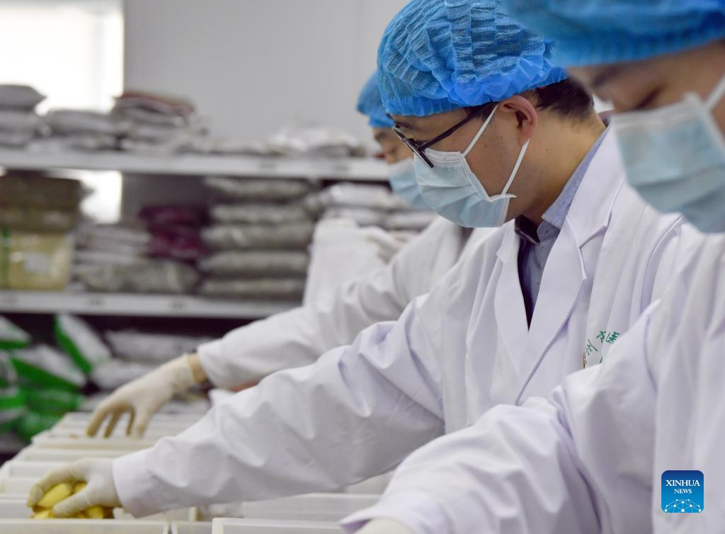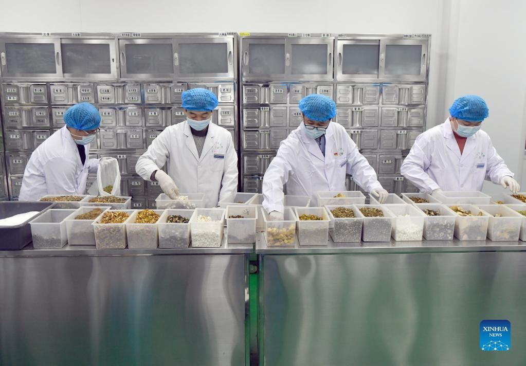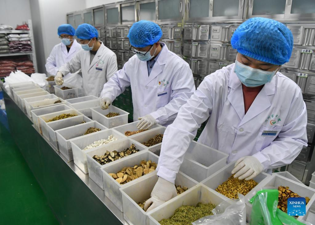 Pharmacists prepare ingredients to produce traditional Chinese medicine (TCM) decoctions at Yuzhou TCM hospital in Yuzhou City, central China's Henan Province, Jan. 13, 2022. Yuzhou of Henan province has introduced TCM to individuals under medical quarantine and medical workers at the frontline to help control the recent spike in COVID-19 infections. (Xinhua/Li Jianan)