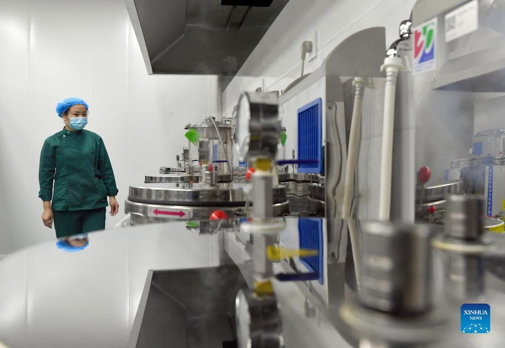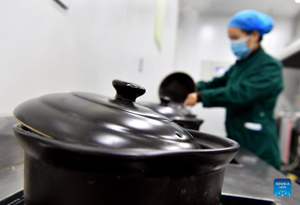 A staff member makes traditional Chinese medicine (TCM) decoctions at Yuzhou TCM hospital in Yuzhou City, central China's Henan Province, Jan. 13, 2022. Yuzhou of Henan province has introduced TCM to individuals under medical quarantine and medical workers at the frontline to help control the recent spike in COVID-19 infections. (Xinhua/Li Jianan)