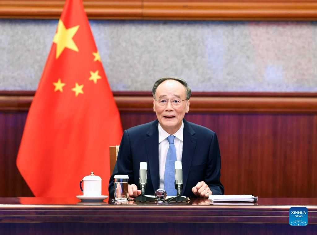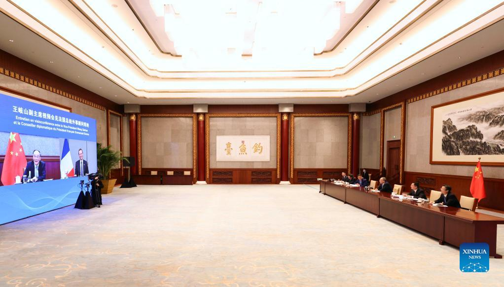 BEIJING, Jan. 13 (Xinhua) -- Chinese Vice President Wang Qishan hailed China-France bilateral relations during a virtual meeting with Emmanuel Bonne, diplomatic counselor to French President Emmanuel Macron in Beijing Thursday.