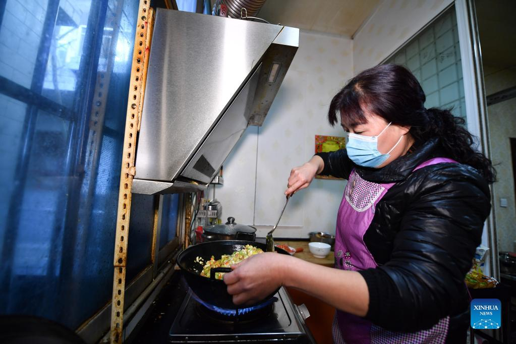 Villager Zhou Juan, a house owner, makes lunch for tenants who live in her house in Sanjia Village of Baqiao District in Xi'an, capital of northwest China's Shaanxi Province, Jan. 12, 2022. Located in Baqiao District of Xi'an, Sanjia Village is an "urban village" inhabited by floating population such as migrant workers. An activity organized to provide two meals for free to residents in need was carried out in the village after the city has been hit by the recent COVID-19 resurgence. (Xinhua/Zhang Bowen)