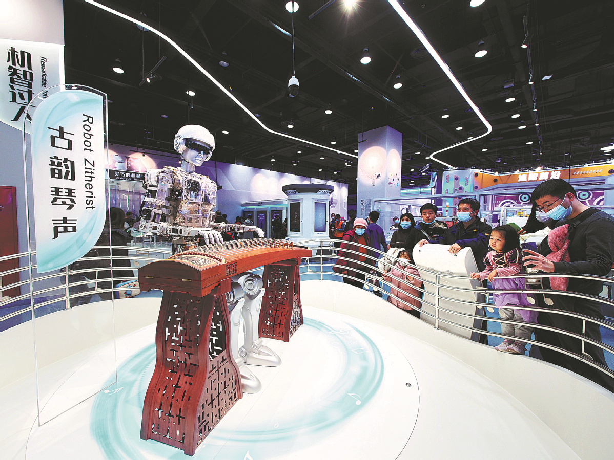 A robot zitherist plays a zither for visitors at the China Science and Technology Museum in Beijing. [Photo by Du Jianpo/for China Daily]
