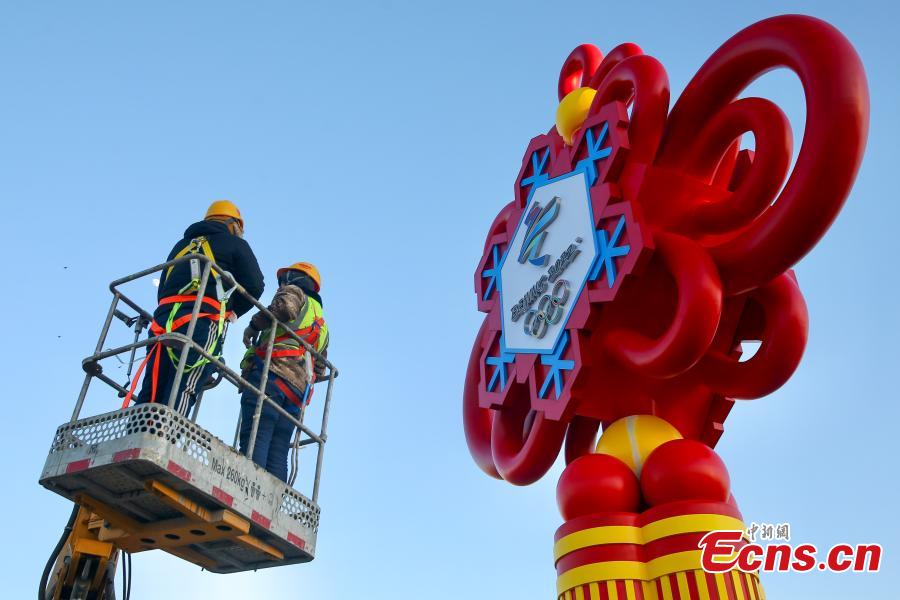 Workers install the Winter Olympics landmark at Tiananmen Square in Beijing, January 13, 2022. (Photo: China News Service/Yi Haifei)
