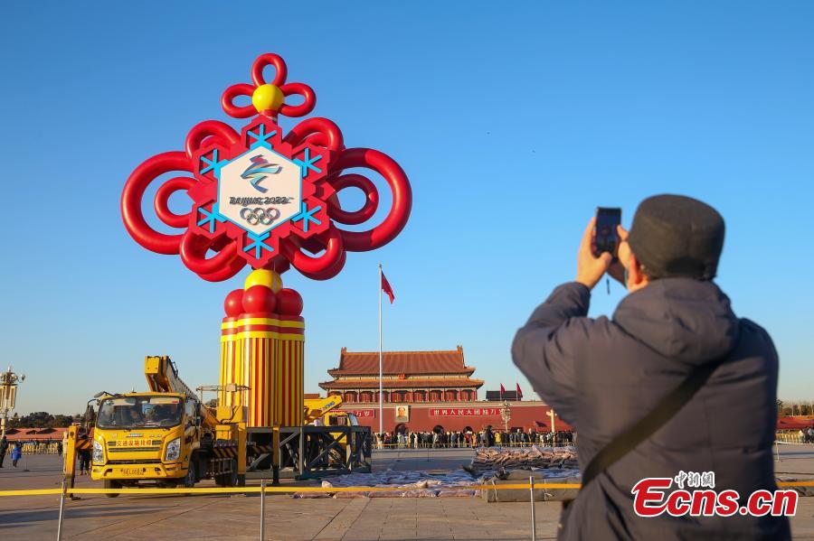 A tourist takes picture of a giant Winter Olympics landmark under construction at Tiananmen Square in Beijing, January 13, 2022. (Photo: China News Service/Yi Haifei)