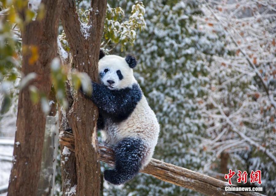 A panda enjoys playing with snow in Wenchuan County of China's Sichuan Province, January 13, 2022. (Photo: China News Service/Chen Xianlin)