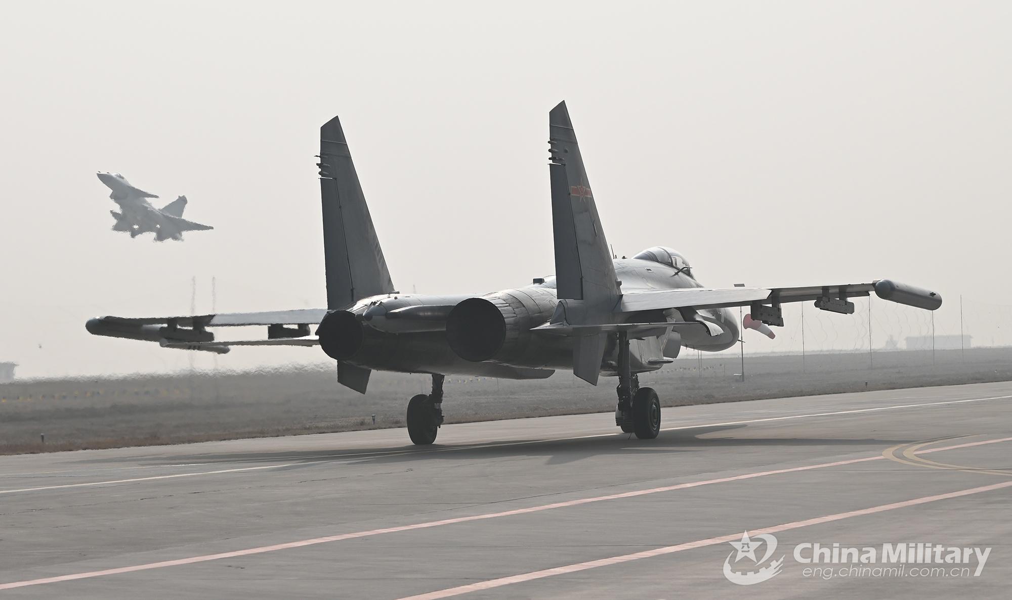 A fighter jet attached to an aviation brigade of the air force under the PLA Western Theater Command taxis on the runway before takeoff for a live-fire air battle training exercise on January 7, 2022. (eng.chinamil.com.cn/Photo by Zhao Tian)