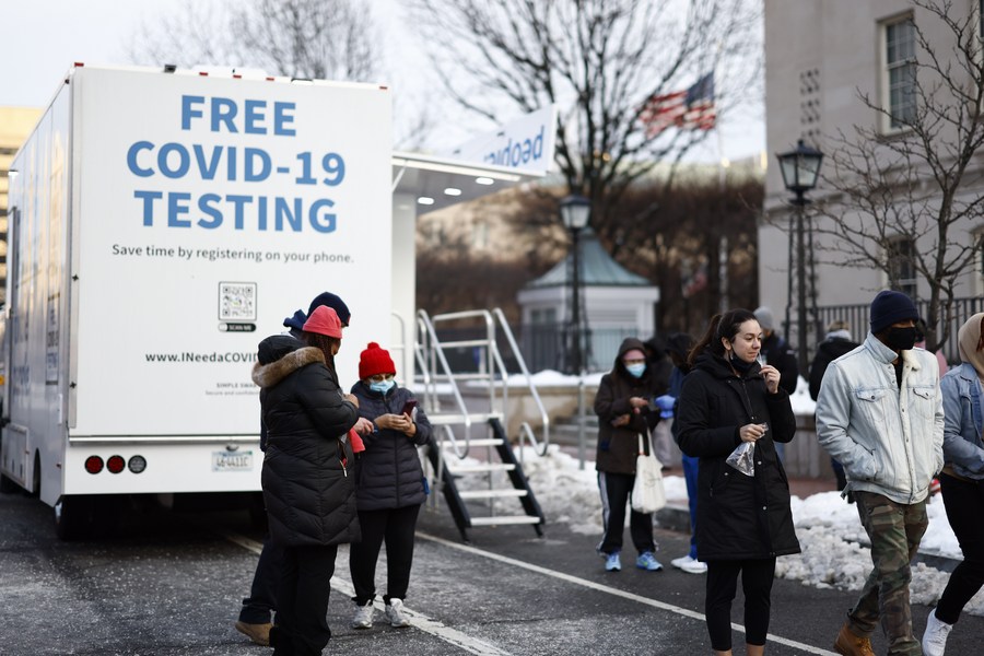 People line up for COVID-19 testing in Washington, D.C., the United States, Jan. 5, 2022. The United States shattered a single-day record with over 1 million COVID-19 cases on Monday amid the rapid spread of Omicron variant and government decisions to ease prevention and control measures in the country. (Photo by Ting Shen/Xinhua)