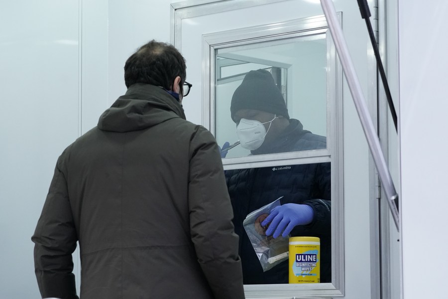 A man waits for COVID-19 testing in Washington, D.C., the United States, Jan. 5, 2022. The United States shattered a single-day record with over 1 million COVID-19 cases on Monday amid the rapid spread of Omicron variant and government decisions to ease prevention and control measures in the country. (Photo by Ting Shen/Xinhua)