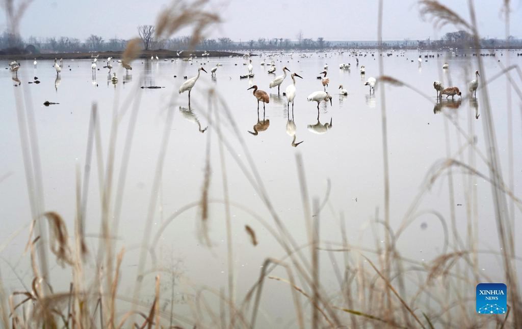 Migratory birds forage at Nanchang Five Stars Siberian Cranes Sanctuary by the Poyang Lake in Nanchang, east China's Jiangxi Province, Jan. 12, 2022. Poyang Lake, the country's largest freshwater lake, is an important wintering spot for migratory birds. To ramp up forage supplies for the birds, in 2021, the local government of Yugan County issued a compensation policy for farmers, and reserved rice for migratory birds. In Nanchang Five Stars Siberian Cranes Sanctuary by the Poyang Lake, cranes have been attracted there for food on a lotus pond. The pond, initiated and invested in by bird lovers in 2017, is expected to provide enough food for the cranes in winter. With the support of local authorities, the pond is also developed into a base for scientific research and education, as well as for international exchanges. (Xinhua/Wan Xiang)