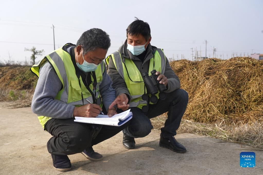 Workers calculate the number of migratory birds at a paddy field in Yugan County, east China's Jiangxi Province, Jan. 11, 2022. Poyang Lake, the country's largest freshwater lake, is an important wintering spot for migratory birds. To ramp up forage supplies for the birds, in 2021, the local government of Yugan County issued a compensation policy for farmers, and reserved rice for migratory birds. In Nanchang Five Stars Siberian Cranes Sanctuary by the Poyang Lake, cranes have been attracted there for food on a lotus pond. The pond, initiated and invested in by bird lovers in 2017, is expected to provide enough food for the cranes in winter. With the support of local authorities, the pond is also developed into a base for scientific research and education, as well as for international exchanges. (Xinhua/Wan Xiang)