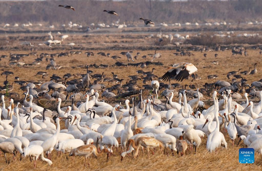 Migratory birds forage at a paddy field in Yugan County, east China's Jiangxi Province, Jan. 11, 2022. Poyang Lake, the country's largest freshwater lake, is an important wintering spot for migratory birds. To ramp up forage supplies for the birds, in 2021, the local government of Yugan County issued a compensation policy for farmers, and reserved rice for migratory birds. In Nanchang Five Stars Siberian Cranes Sanctuary by the Poyang Lake, cranes have been attracted there for food on a lotus pond. The pond, initiated and invested in by bird lovers in 2017, is expected to provide enough food for the cranes in winter. With the support of local authorities, the pond is also developed into a base for scientific research and education, as well as for international exchanges. (Xinhua/Wan Xiang)