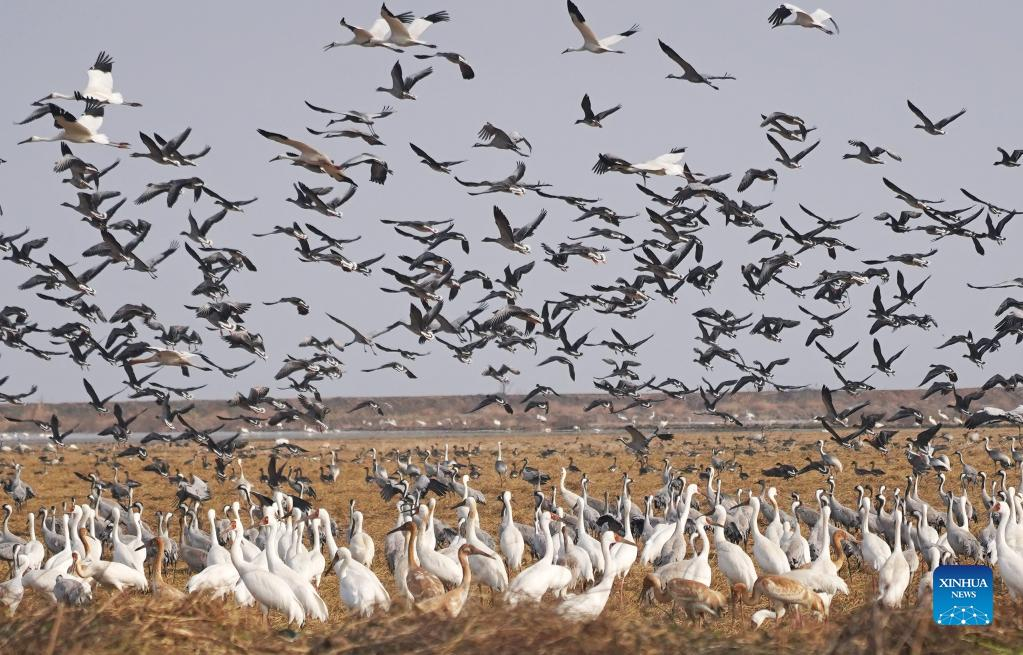 Migratory birds forage at a paddy field in Yugan County, east China's Jiangxi Province, Jan. 11, 2022. Poyang Lake, the country's largest freshwater lake, is an important wintering spot for migratory birds. To ramp up forage supplies for the birds, in 2021, the local government of Yugan County issued a compensation policy for farmers, and reserved rice for migratory birds. In Nanchang Five Stars Siberian Cranes Sanctuary by the Poyang Lake, cranes have been attracted there for food on a lotus pond. The pond, initiated and invested in by bird lovers in 2017, is expected to provide enough food for the cranes in winter. With the support of local authorities, the pond is also developed into a base for scientific research and education, as well as for international exchanges. (Xinhua/Wan Xiang)