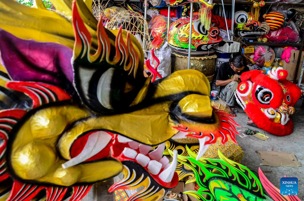 A worker makes a traditional lion head for the upcoming Chinese New Year celebration in Bogor, West Java, Indonesia, on Jan. 15, 2022. (Photo by Sandika Fadilah/Xinhua)