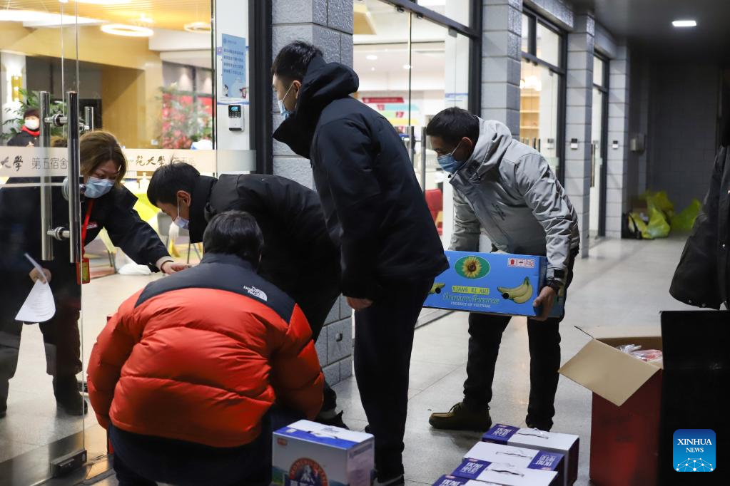 Staff members carry milk and fruits to a dormitory under closed-off management in East China Normal University in Shanghai, east China, Jan. 14, 2022. A dormitory on Putuo campus of East China Normal University has been put under closed-off management for 48 hours since Jan. 14 for COVID-19 control. Nearly 500 students and dorm managers who stayed on the campus during winter vacation have received nucleic acid tests. Meanwhile, the university has prepared supplies for those in need. (East China Normal University/Handout via Xinhua)