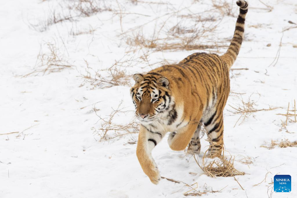 Photo taken on Jan. 15, 2022 shows a Siberian tiger at the Siberian Tiger Park in northeast China's Heilongjiang Province. (Xinhua/Zhang Tao)