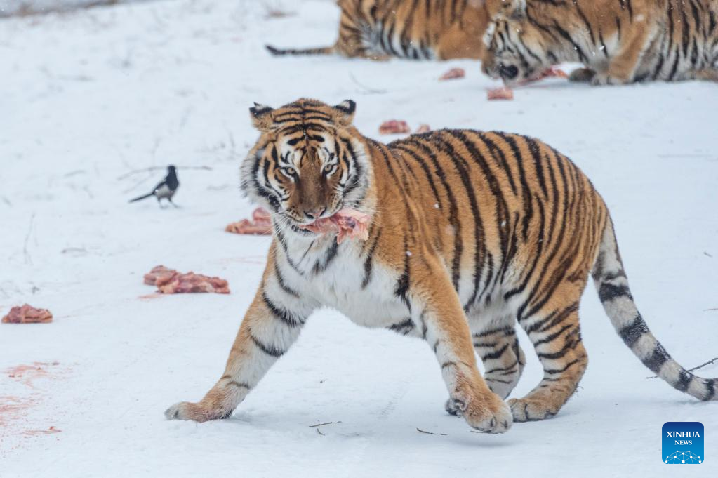 Photo taken on Jan. 15, 2022 shows a Siberian tiger eating at the Siberian Tiger Park in northeast China's Heilongjiang Province. (Xinhua/Xie Jianfei)