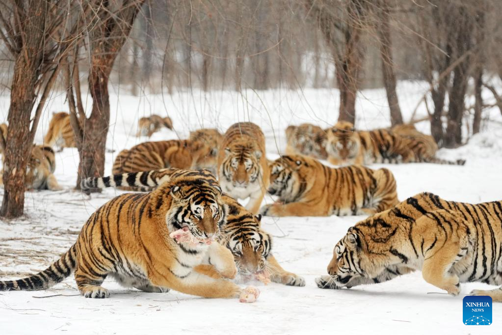 Photo taken on Jan. 15, 2022 shows Siberian tigers eating at the Siberian Tiger Park in northeast China's Heilongjiang Province. (Xinhua/Wang Jianwei)