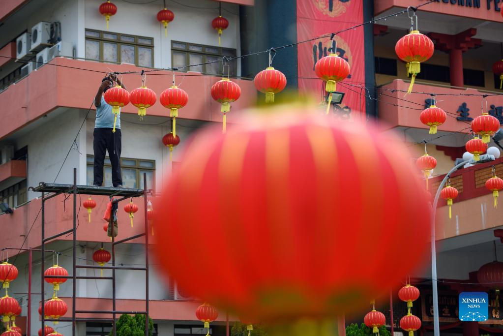 A man hangs lanterns for the upcoming Spring Festival, or the Chinese Lunar New Year, in Klang of Selangor states, Malaysia, Jan. 16, 2022. (Photo by Chong Voon Chung/Xinhua)