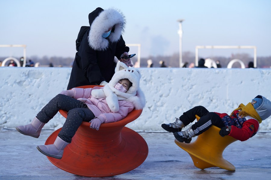 People enjoy ice-snow fun on the frozen Songhua River in Harbin, northeast China's Heilongjiang Province, Jan. 8, 2022. (Xinhua/Wang Jianwei)