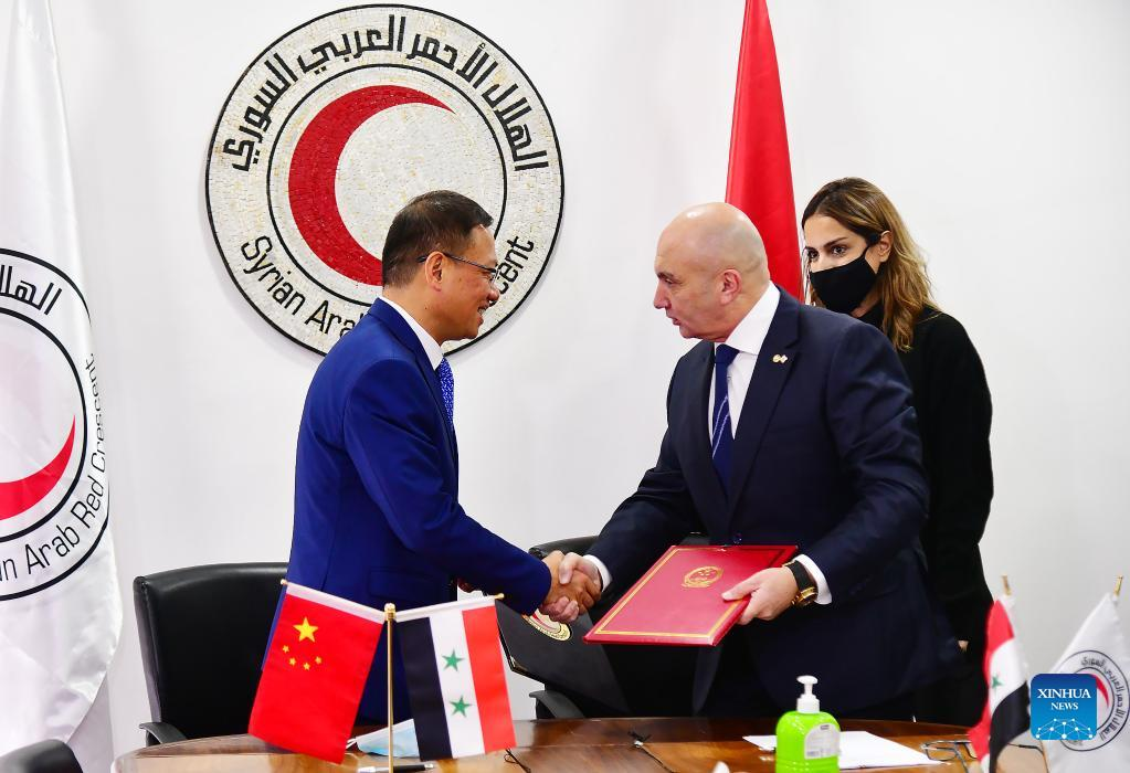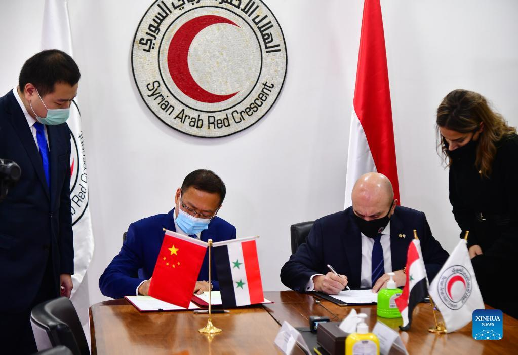 Chinese Ambassador to Syria Feng Biao (2nd L) and Khaled Hboubati (2nd R), the head of the Syrian Arab Red Crescent (SARC), sign a delivery note for the food aid in Damascus, Syria, on Jan. 16, 2022. Syria received more than 4,000 tons of rice from China on Sunday, the latest in a long line of humanitarian supplies China has provided to Syria to ease the Syrian people's suffering. (Photo by Ammar Safarjalani/Xinhua)