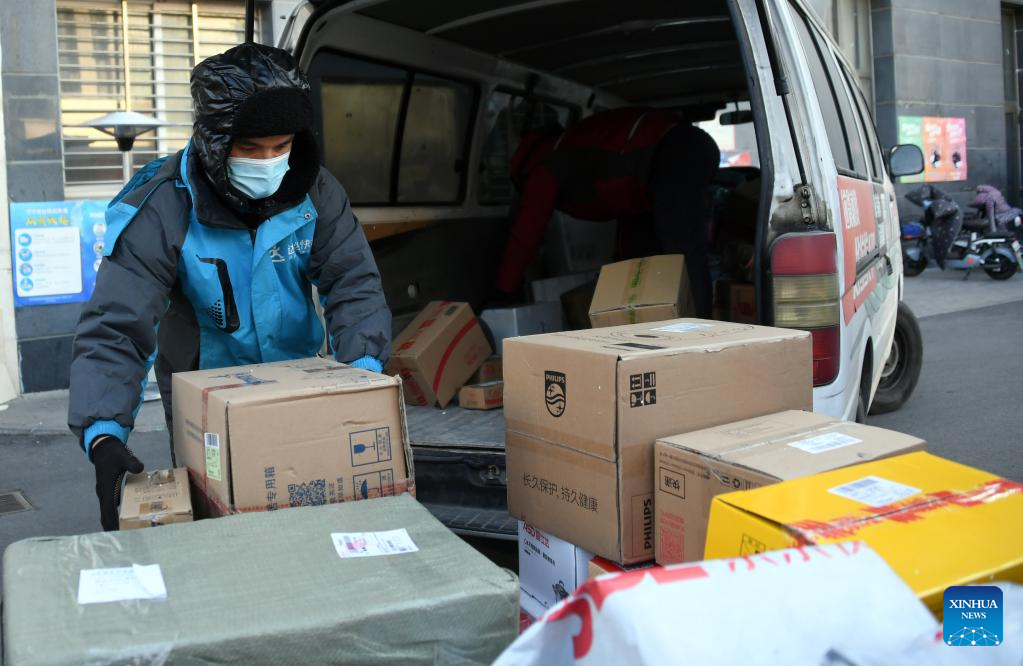 A courier arranges parcels to be delivered to residents at a residential compound in Haidian District of Beijing, capital of China, Jan. 16, 2022. Beijing reported one new locally-transmitted COVID-19 case Saturday, local health authority said. The community where the comfirmed case lives is under close-off management. (Xinhua/Ren Chao)