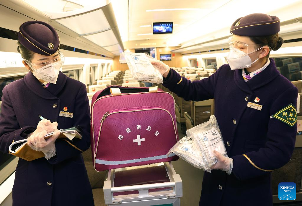 Crew members prepare epidemic prevention kits on train G1724 in east China's Shanghai, Jan. 16, 2022. The Spring Festival travel rush, China's largest annual travel rush, will last from Jan. 17 to Feb. 25 this year. During the 40-day travel season, also known as chunyun, many Chinese people will travel to meet their families for the Chinese Lunar New Year, or Spring Festival, which will fall on Feb. 1, 2022. (Xinhua/Chen Fei)