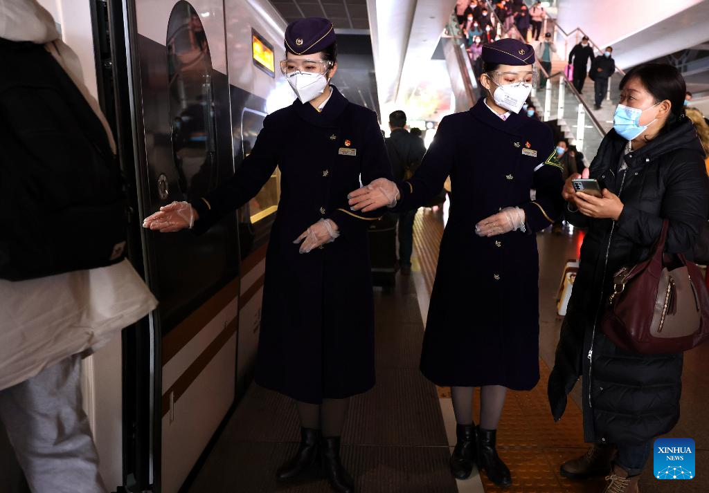 Crew members guide a passenger to board train G1724 at Shanghai Hongqiao Railway Station in east China's Shanghai, Jan. 16, 2022. The Spring Festival travel rush, China's largest annual travel rush, will last from Jan. 17 to Feb. 25 this year. During the 40-day travel season, also known as chunyun, many Chinese people will travel to meet their families for the Chinese Lunar New Year, or Spring Festival, which will fall on Feb. 1, 2022. (Xinhua/Chen Fei)