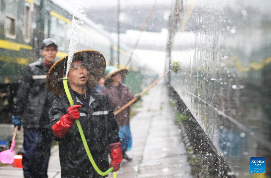 Staff members clean train carriages at a service garage in Hengyang, central China's Hunan Province, Jan. 16, 2022. The Spring Festival travel rush, China's largest annual travel rush, will last from Jan. 17 to Feb. 25 this year. During the 40-day travel season, also known as chunyun, many Chinese people will travel to meet their families for the Chinese Lunar New Year, or Spring Festival, which will fall on Feb. 1, 2022. (Photo by Cao Zhengping/Xinhua)