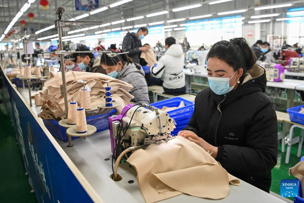 Workers are seen at a workshop of the production base of Erke in Tianjin industrial park in Yutian County, northwest China's Xinjiang Uygur Autonomous Region, Jan. 14, 2022. Yutian County, once a poverty-stricken area in Xinjiang, has stepped up the development of labour-intensive industries including textile, clothes and sock making.