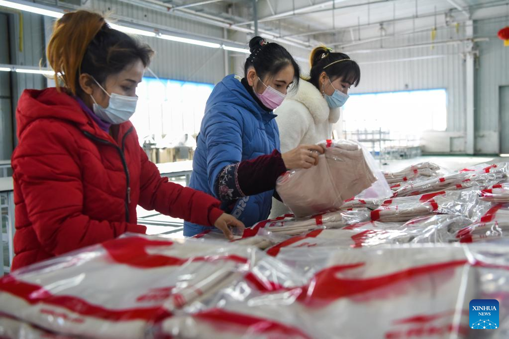 Workers arrange clothing products at a workshop in the production base of Erke in Tianjin industrial park in Yutian County, northwest China's Xinjiang Uygur Autonomous Region, Jan. 13, 2022. Yutian County, once a poverty-stricken area in Xinjiang, has stepped up the development of labour-intensive industries including textile, clothes and sock making.
