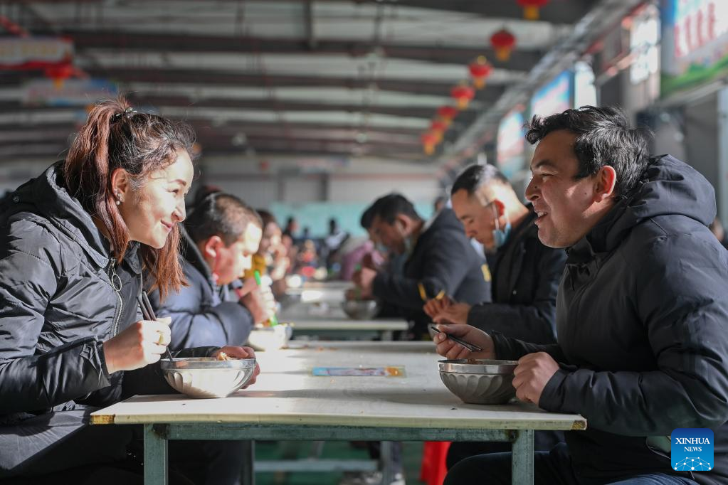 Maynurhan Amang (L front) and Abudulezizi Maisedi (R front) chat during lunch time at a canteen of Tianjin industrial park in Yutian County, northwest China's Xinjiang Uygur Autonomous Region, Jan. 13, 2022. Yutian County, once a poverty-stricken area in Xinjiang, has stepped up the development of labour-intensive industries including textile, clothes and sock making.