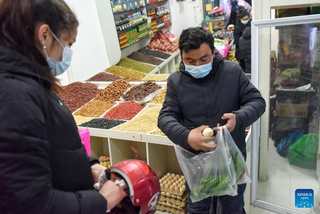 Abudulezizi Maisedi (R) buys vegetables at a commercial street of Tianjin industrial park in Yutian County, northwest China's Xinjiang Uygur Autonomous Region, Jan. 13, 2022. Yutian County, once a poverty-stricken area in Xinjiang, has stepped up the development of labour-intensive industries including textile, clothes and sock making.
