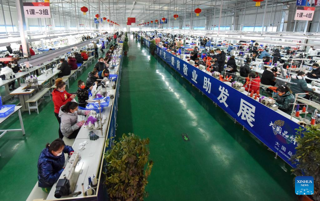 Photo shows an interior view of a workshop at the production base of Erke in Tianjin industrial park in Yutian County, northwest China's Xinjiang Uygur Autonomous Region, Jan. 13, 2022. Yutian County, once a poverty-stricken area in Xinjiang, has stepped up the development of labour-intensive industries including textile, clothes and sock making.
