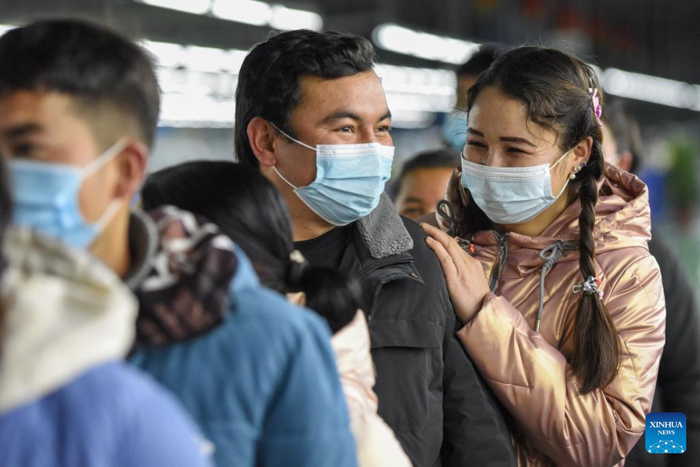 Maynurhan Amang (1st R) and Abudulezizi Maisedi (2nd R) are seen at the production base of Erke in Tianjin industrial park in Yutian County, northwest China's Xinjiang Uygur Autonomous Region, Jan. 14, 2022. Yutian County, once a poverty-stricken area in Xinjiang, has stepped up the development of labour-intensive industries including textile, clothes and sock making.