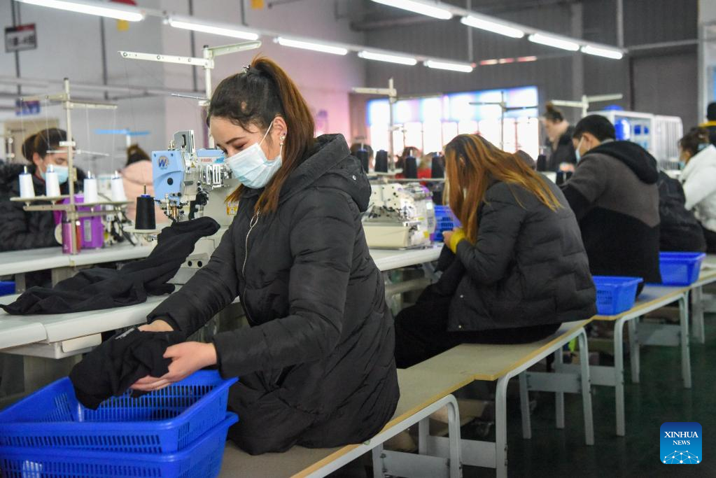 Maynurhan Amang (front) work at a workshop in the production base of Erke in Tianjin industrial park in Yutian County, northwest China's Xinjiang Uygur Autonomous Region, Jan. 13, 2022. Yutian County, once a poverty-stricken area in Xinjiang, has stepped up the development of labour-intensive industries including textile, clothes and sock making.