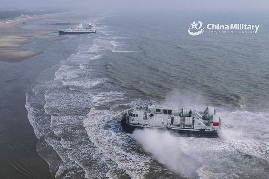 Two Landing Craft Air Cushions(LCACs) attached to a naval landing ship flotilla under the PLA Southern Theater Command approach the coast during a beach landing training exercise on January 6, 2022. (eng.chinamil.com.cn/Photo by Ze Tianyu)
