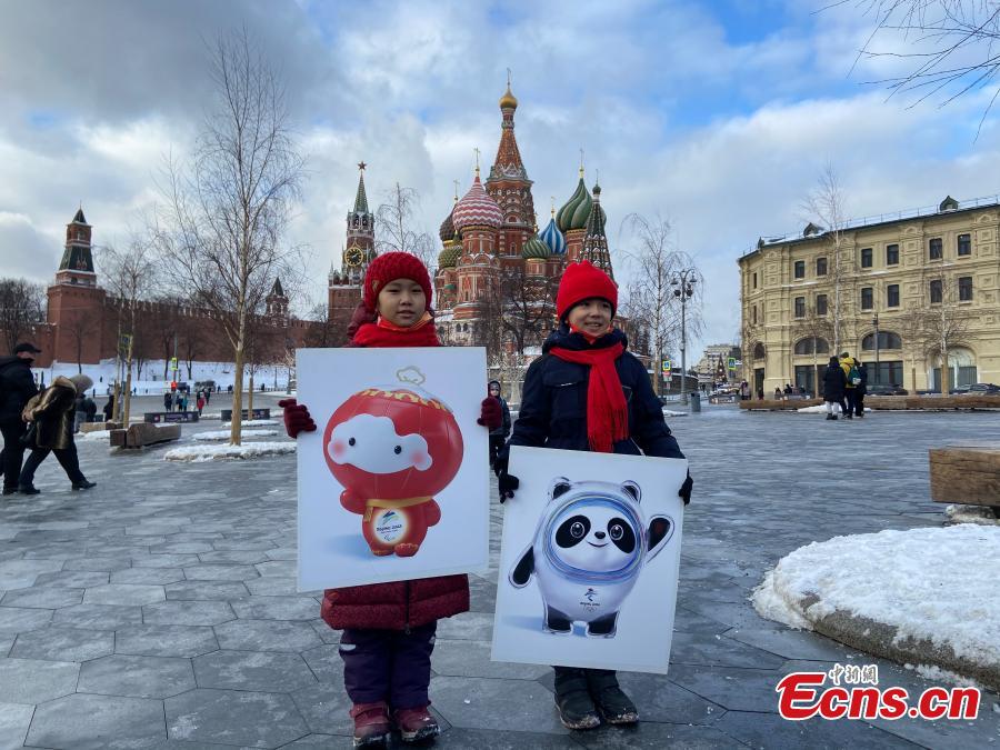 Two children hold pictures of "Bing Dwen Dwen" and "Shuey Rhon Rhon," mascots of the Beijing2022 Winter Olympic and Paralympic Games, in Moscow, Russia, Jan. 16, 2022. (Photo: China News Service/Tian Bing)