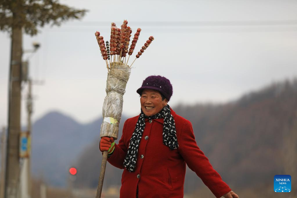A villager prepares to sell homemade sugar-coated haws on a "slow train" at Shicheng Station in Fengcheng City, northeast China's Liaoning Province, Jan. 15, 2022. Trains No. 4317 and 4318 are "slow trains" operating between Tonghua of Jilin Province and Dandong of Liaoning Province in northeast China. In the run-up to the Lunar New Year, the local railway authorities have been organizing onboard markets which allow villagers living along the trains' route to sell goods to passengers without leaving the train cars. (Xinhua/Yang Qing)