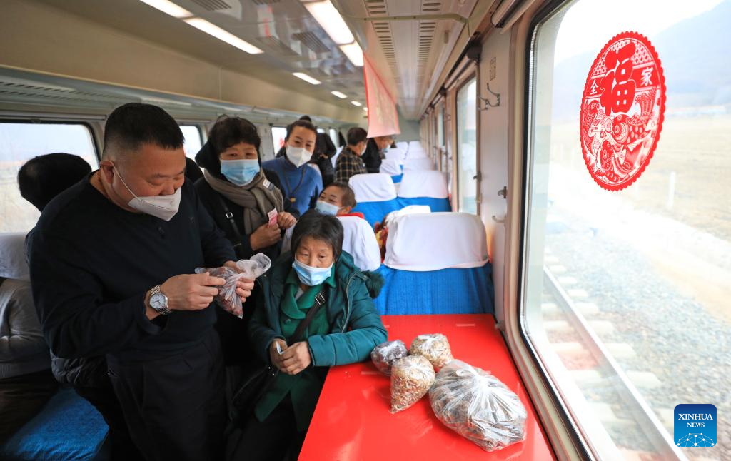 Passengers buy goods sold by local villagers on train No. 4318 in northeast China's Liaoning Province, Jan. 15, 2022. Trains No. 4317 and 4318 are "slow trains" operating between Tonghua of Jilin Province and Dandong of Liaoning Province in northeast China. In the run-up to the Lunar New Year, the local railway authorities have been organizing onboard markets which allow villagers living along the trains' route to sell goods to passengers without leaving the train cars. (Xinhua/Yang Qing)