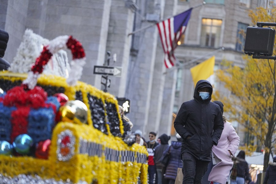 Pedestrians walk by a holiday installation on a street in New York, the United States, Nov. 23, 2021. (Xinhua/Wang Ying)
