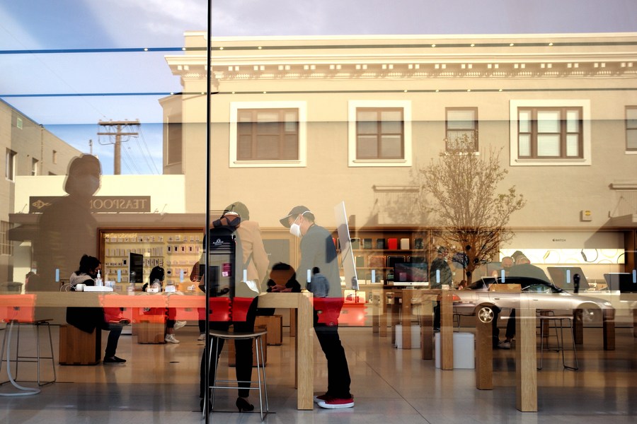 Street view is reflected on the window of an Apple store which has resumed operation in Burlingame city in north California, the United States, April 11, 2021. (Xinhua/Wu Xiaoling)