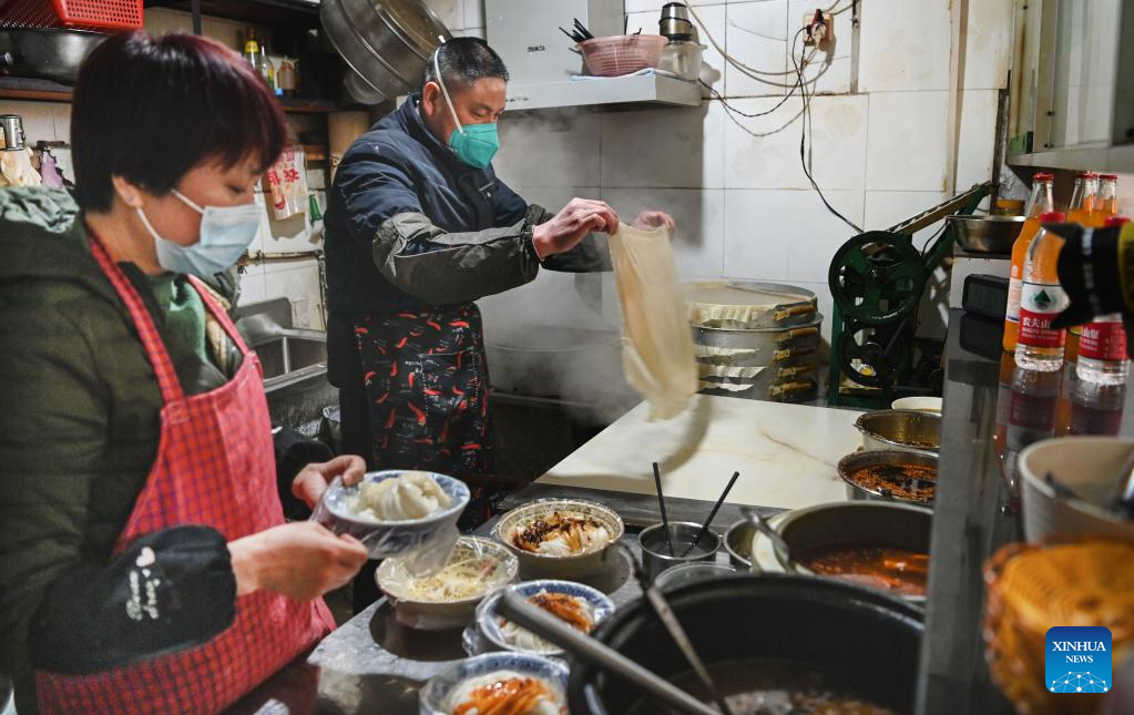 Staff members prepare food for delivery at a snack booth in Xi'an, capital of northwest China's Shaanxi Province, Jan. 17, 2022. People's life in Xi'an has been gradually back on track in some parts of the city as the new locally-transmitted COVID-19 cases dropped to single digits in a sixth consecutive day on Sunday. (Xinhua/Tao Ming)