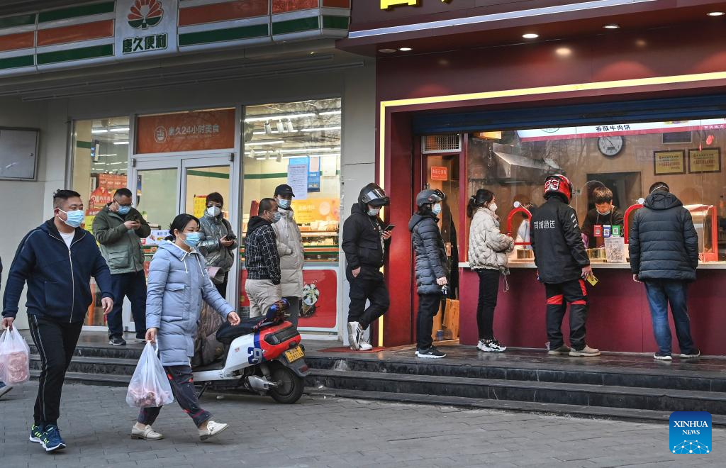 People line up to buy food at a booth in Xi'an, capital of northwest China's Shaanxi Province, Jan. 17, 2022. People's life in Xi'an has been gradually back on track in some parts of the city as the new locally-transmitted COVID-19 cases dropped to single digits in a sixth consecutive day on Sunday. (Xinhua/Tao Ming)