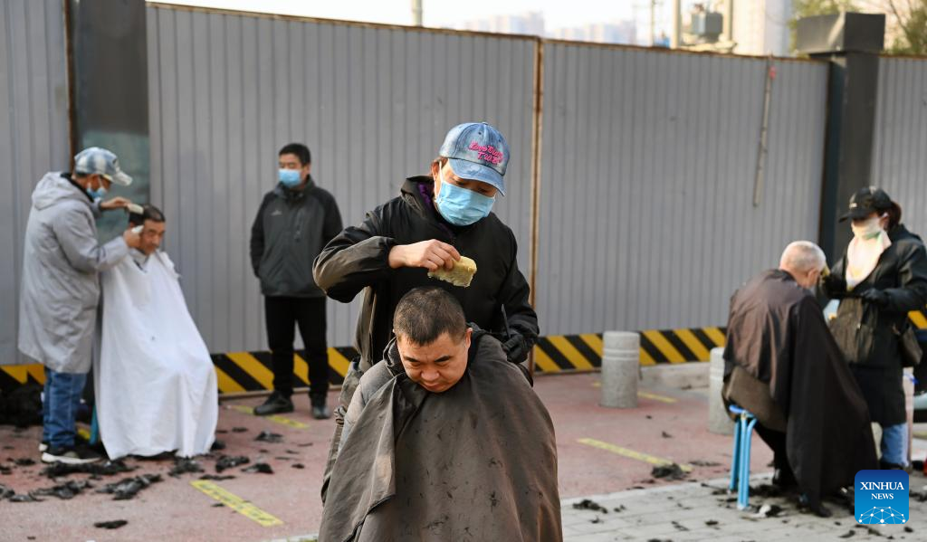 People have their hair cut at an open-air area in Xi'an, capital of northwest China's Shaanxi Province, Jan. 17, 2022. People's life in Xi'an has been gradually back on track in some parts of the city as the new locally-transmitted COVID-19 cases dropped to single digits in a sixth consecutive day on Sunday. (Xinhua/Tao Ming)
